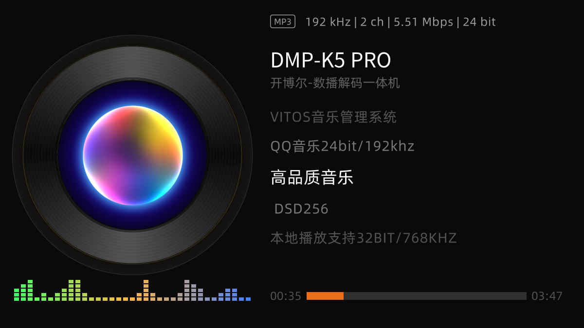 开博尔推出全新“高速反应”的DMP-K5 PRO数播解码一体机,作为台式HiFi数播解码一体机,其15秒内可实现的开机速度,或让众多HiFi老烧玩家收获惊喜。岂止于快,这款以“用户舒适区至上”的新品硬盘播放器,用“开博尔硬件+VitOS APP+强大的本地音乐+QQ音乐等流媒体真实内嵌”的华丽组合,把HiFi玩家繁琐的设备规划,化作自然而然的音乐享受。